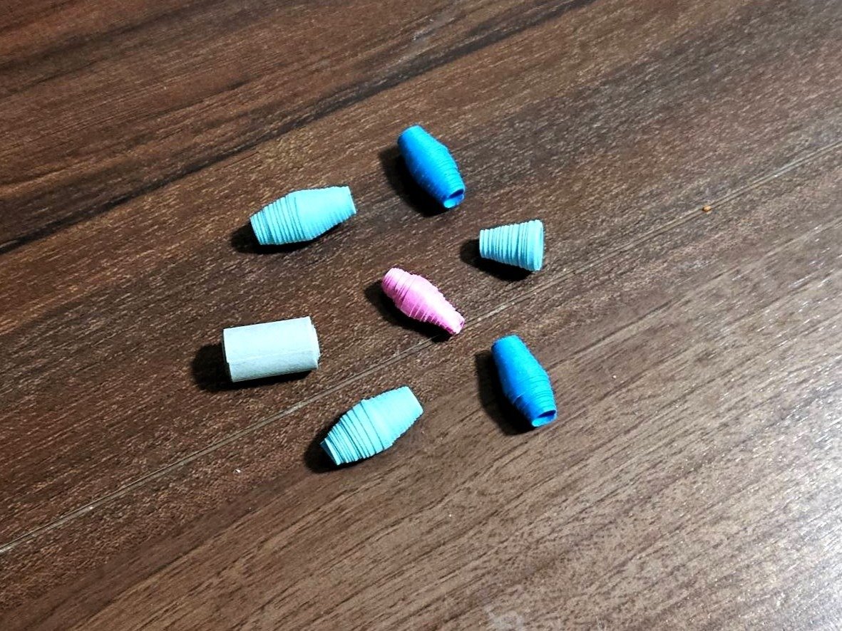 紙の長さや形、巻き付けるものの太さを変えるといろいろなビーズができて、とても面白いです♪