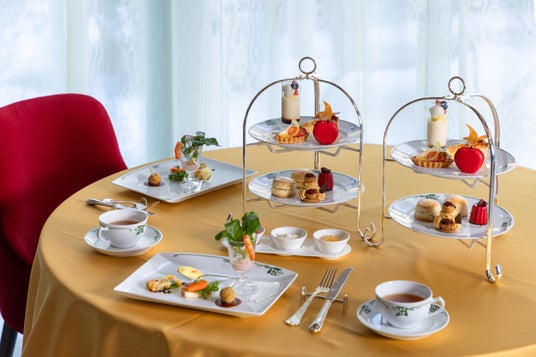 万平ホテルの歴史と魅力が詰まった、この冬限定のアフタヌーンティーをご用意いたしました。カフェテラスで人気のクラシックプリンやレモンタルトをアフタヌーンティー用に特別アレンジし、アップルパイのりんごフィリングを挟んだマカロンや、ロイヤルミルクティー風味のサントノーレなど、万平ホテルらしいクラシックなスイーツ8種をお楽しみいただけます。セイボリーには、ホテルの象徴であるステンドグラスをイメージした野菜のプレッセや、エビとクレソンのカクテルサラダなど、彩り豊かな5種をご用意。軽井沢の冬景色を眺めながら、心温まるひとときをお過ごしください。