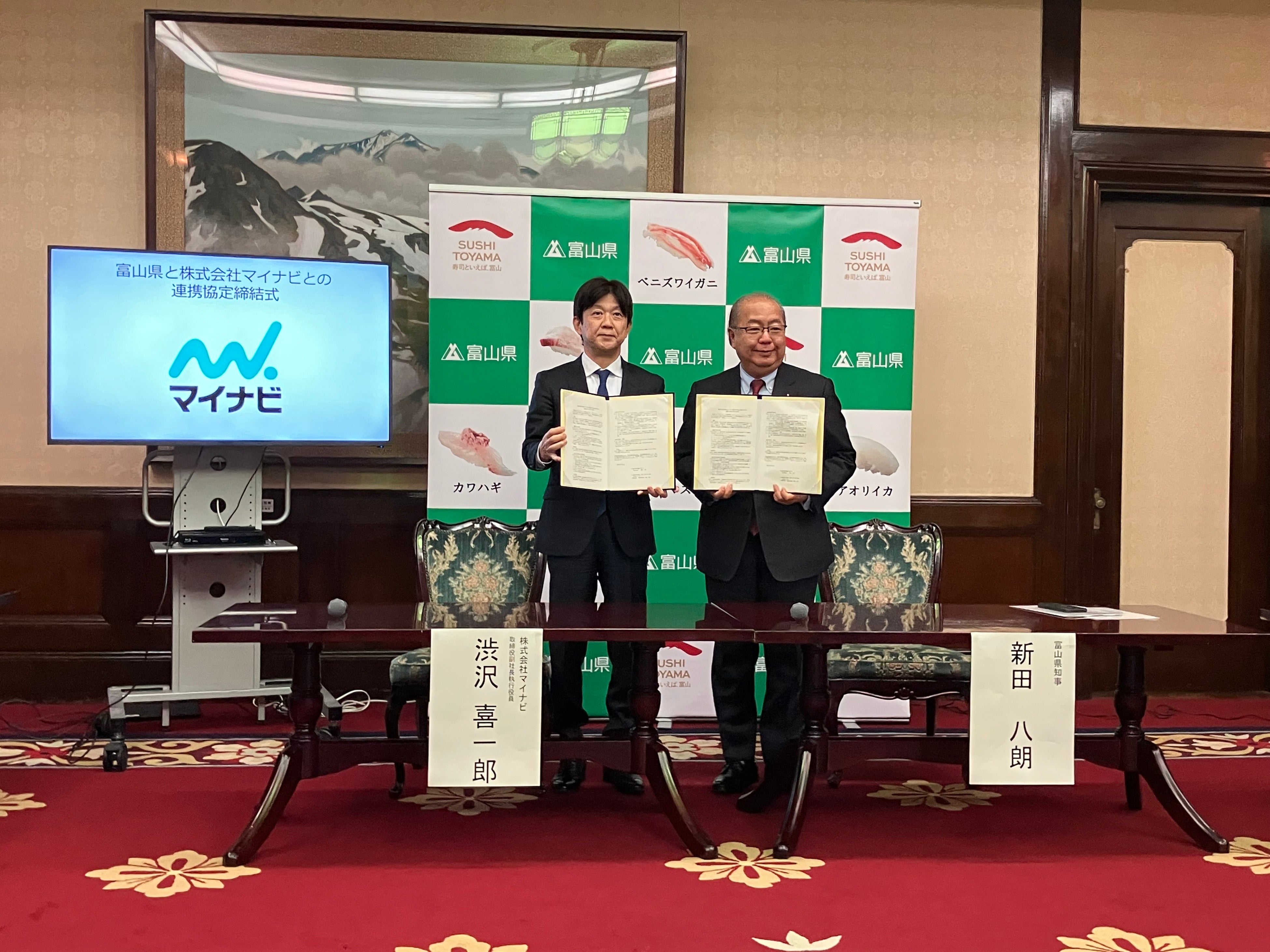 (左:マイナビ・渋沢喜一郎取締役 副社長執行役員/右:富山県・新田八郎知事)
