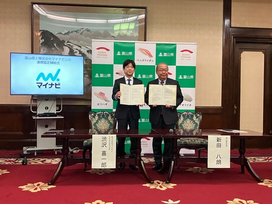 株式会社マイナビ(本社:東京都千代田区、代表取締役 社長執行役員:粟井俊介)は、富山県(知事:新田八朗)と「富山県と株式会社マイナビとの選ばれる富山の創出に向けた連携と協力に関する協定書」を締結し、1月13日(火)に富山県庁(富山県富山市)にて協定締結式を行いました。