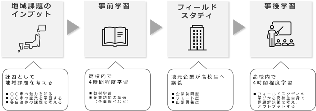 学習の導入として、各自治体の総合計画などを参考にして地域課題を学びます。その後、高校内で動画の視聴やワークを行い、企業活動や課題解決の考え方について学びを深めていきます。
