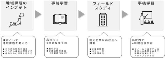 地域企業と接点を持つ「フィールドスタディ」※では、高校生が企業から直接、課題解決事例を学び、その後クラス内でアウトプットをすることで、生徒の思考の幅を広げて、自ら課題を発見し解決する力を身につけることにつなげていきます。