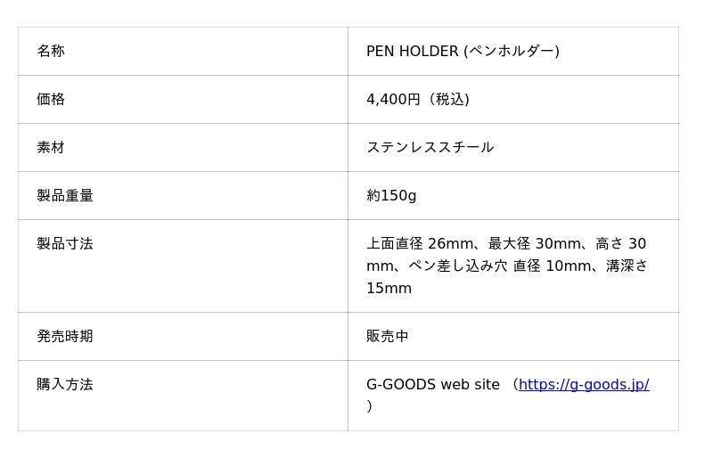 1951年創業、金属加工を専門とする株式会社後藤鉄工所(本社:新潟県三条市)のファクトリーブランド「G-GOODS(ジーグッズ)」は、愛用のペンを「デスクペン」へと変える新商品『PEN HOLDER(ペンホルダー)』の販売を開始いたしました。