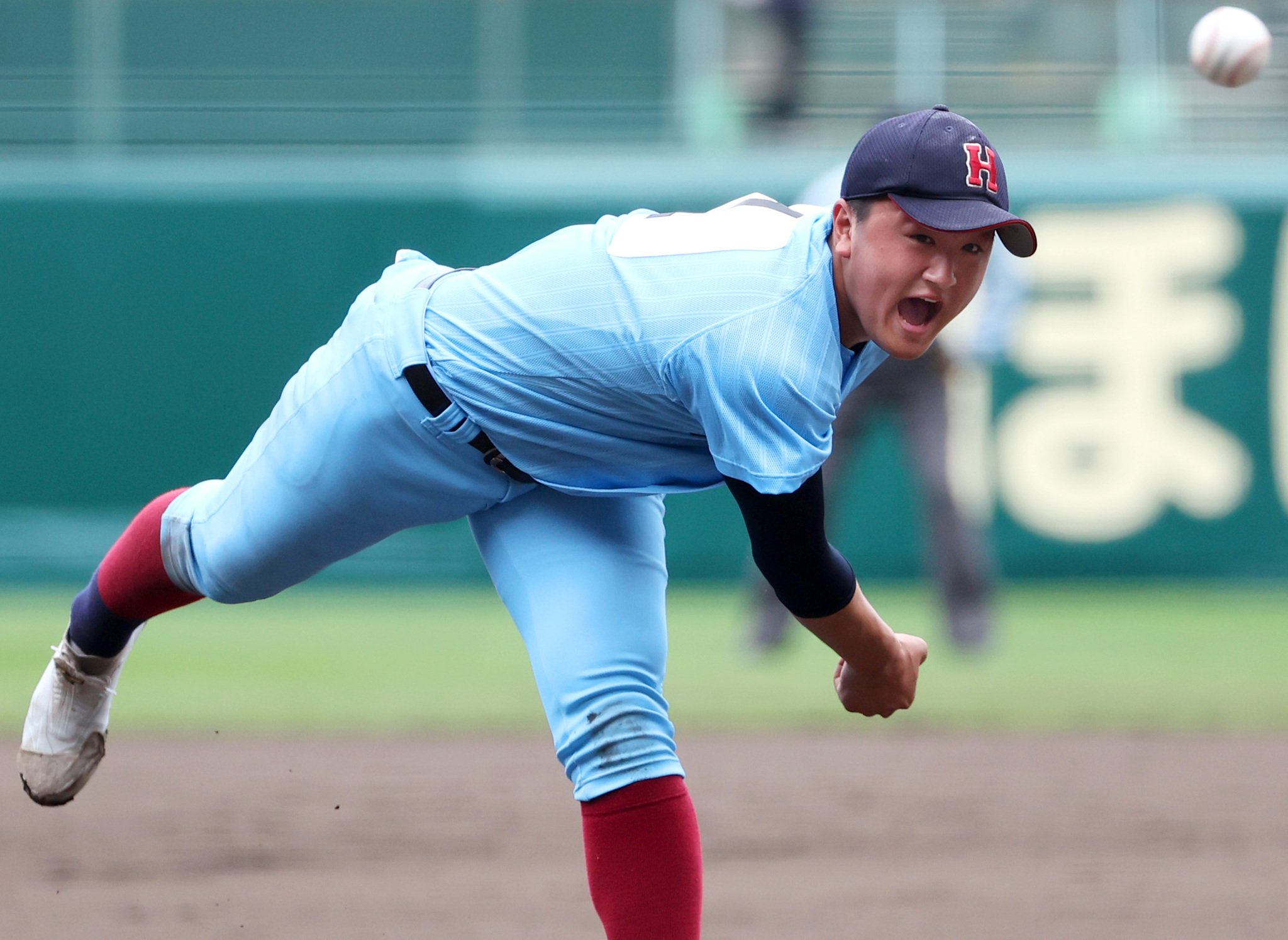 第95回選抜高校野球大会で気迫のこもった投球を見せる青野=2023年、甲子園