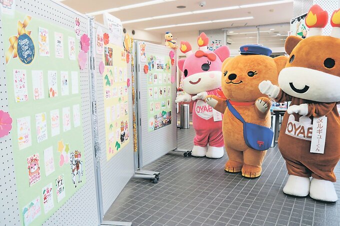 2体と日本郵便の公式キャラ、ぽすくまの着ぐるみが初日の15日、来場して展示をPR。メルギューくんは「小矢部市のPRが“うま”くいくように、メルモモちゃんと頑張るメル~」とコメントした。年賀状には全て返信する。