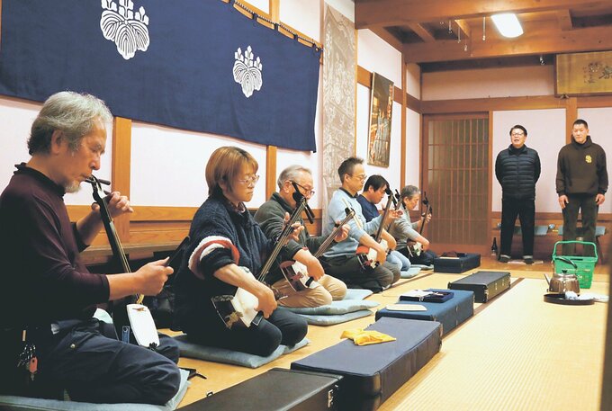 富山市八尾町の諏訪町おわら保存会は15日夜、地元の諏訪町公民館で初稽古に臨んだ。楽器や唄(うた)を担う地方衆16人が気持ちを新たに、腕を磨いた。