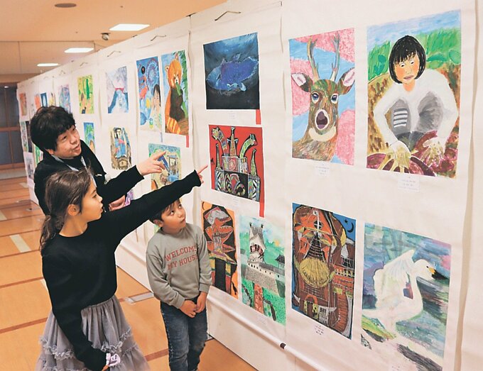 習字は力強く書いた「うま」や、はねやはらいが美しい「初明かり」などが飾られた。図画では猫やレッサーパンダなどの動物や校舎などの風景を、子どもたちが生き生きと描いている。