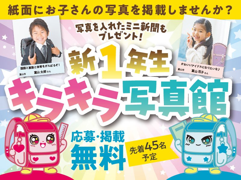 この春、小学校に入学される新1年生の写真を、目標や将来の夢とともに3月20日(金・祝)の北日本新聞朝刊と、北日本新聞社の総合情報サイト「webunプラス」に掲載します。応募された方には、後日、写真を入れた特別ミニ新聞をプレゼントします。ご入学の記念に!おじいちゃん・おばあちゃんへのプレゼントに!ぜひご応募ください。