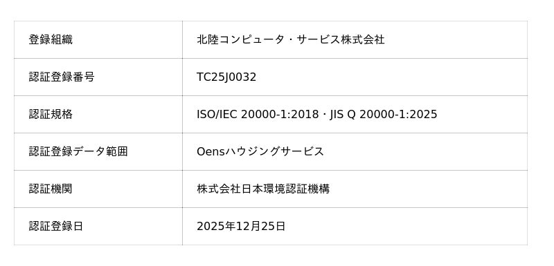 北陸コンピュータ・サービス株式会社(富山市婦中町、代表取締役社長 小嶋 達也)は、Oensハウジングサービスにおいて、ITサービスマネジメントシステム(ITSMS)の国際規格である「ISO/IEC 20000-1:2018」の認証を取得いたしました。今回の認証取得により、弊社の Oensハウジングサービスにおける ITサービスマネジメントシステムが、国際規格の求める要件を満たしていることが第三者認証機関により正式に証明されたことになります。