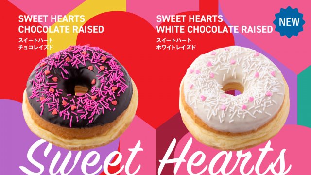 今回新発売する『スイートハート チョコレイズド』は、濃厚な甘さのチョコアイシングに赤のハート型とピンクのスプリンクルを、『スイートハート ホワイトレイズド』は、優しい甘さのホワイトチョコにピンクのハート型と白のスプリンクルをトッピングした。華やかでかわいい見た目がバレンタインデーやホワイトデーのギフトなどにも最適な季節限定ドーナツとなっている。
