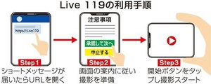 Live119は、司令員が必要と判断した場合、通報者のスマートフォンにショートメッセージを送る。届いたURLを開くと、専用画面が立ち上がり、撮影を始められる。近年、全国的に導入する消防本部が増えている。