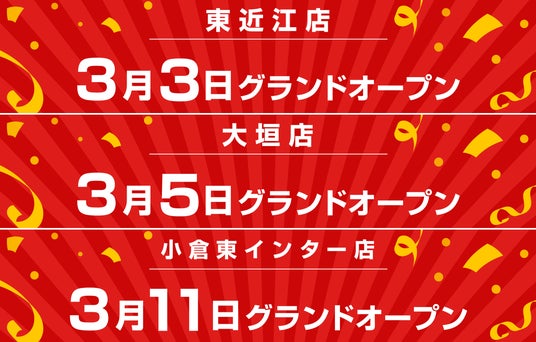 カー&バイク用品のリユース専門店「アップガレージ」を全国展開する株式会社アップガレージグループ(本社:神奈川県横浜市、代表取締役社長:河野映彦、東証スタンダード市場:7134)は、2026年3月より順次、「アップガレージ東近江店(滋賀県)」、「アップガレージ大垣店(岐阜県)」、「アップガレージ小倉東インター店(福岡県)」を新規出店いたします。 各店ともグランドオープンに先駆け、2月より買取先行プレオープンを実施いたします。