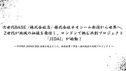 地域企業の海外進出支援・共創事業開発を行う「株式会社 忍」(本社:新潟県新潟市、代表取締役:坂井壮眞、以下 忍)は、プラットフォーム運営や共創事業創出に取り組む株式会社ネオシーム(本社:新潟県新潟市、代表取締役:岩田文月)と、新潟の食・工芸・文化をZ世代の視点で世界へ届ける共創プロジェクト「JIDAI」を発足いたしました。