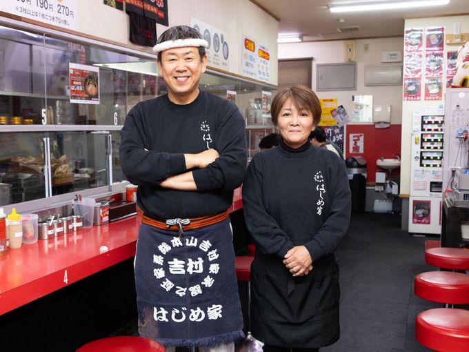 開店前から並ぶ人で列ができる。横浜家系ラーメンの総本山「吉村家」(横浜市)からのれん分けした「はじめ家」だ。のれん分け店の中でも四天王と呼ばれる。「ラーメン」は、豚骨と鶏がらがベースのこく深いスープに特製しょうゆだれが加わり、一度口にするとまた無性に食べたくなる味。多くの人をとりこにしている。