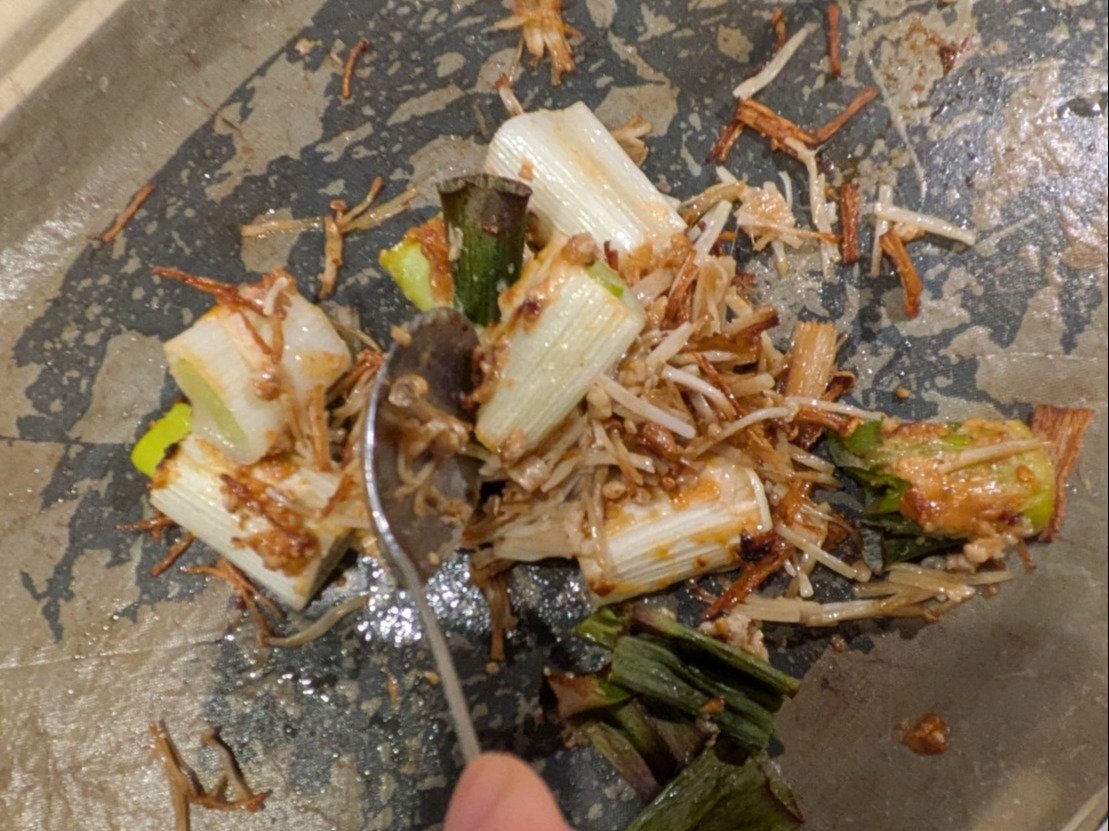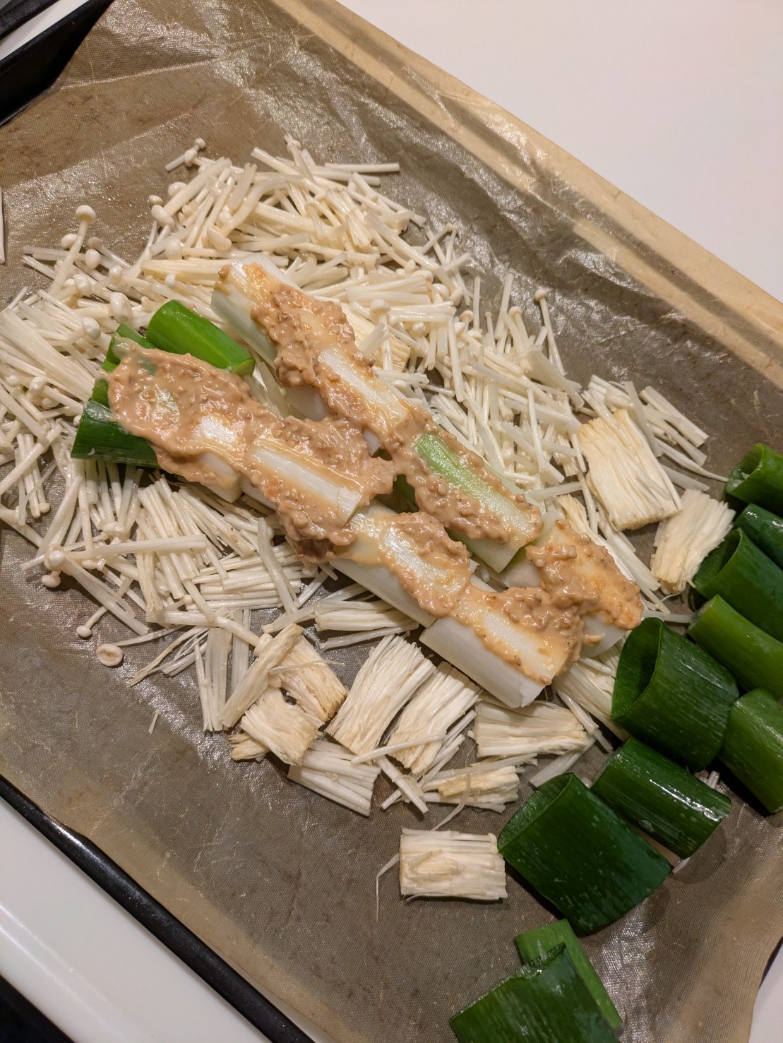 ③鉄板にクッキングシートを敷き、②のえのきをまんべんなく広げ、その上にねぎを並べる。
