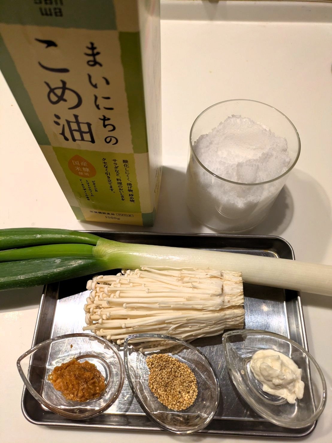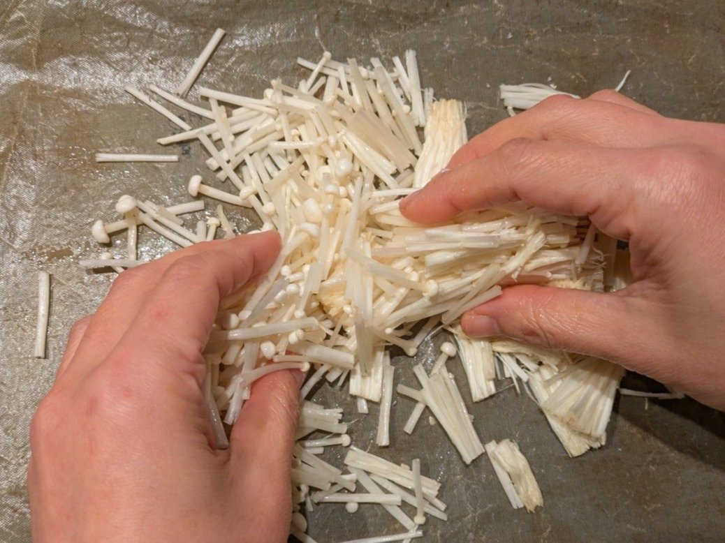 ②えのきも食べやすい大きさに切り、米油と塩をしっかりもみ込む。