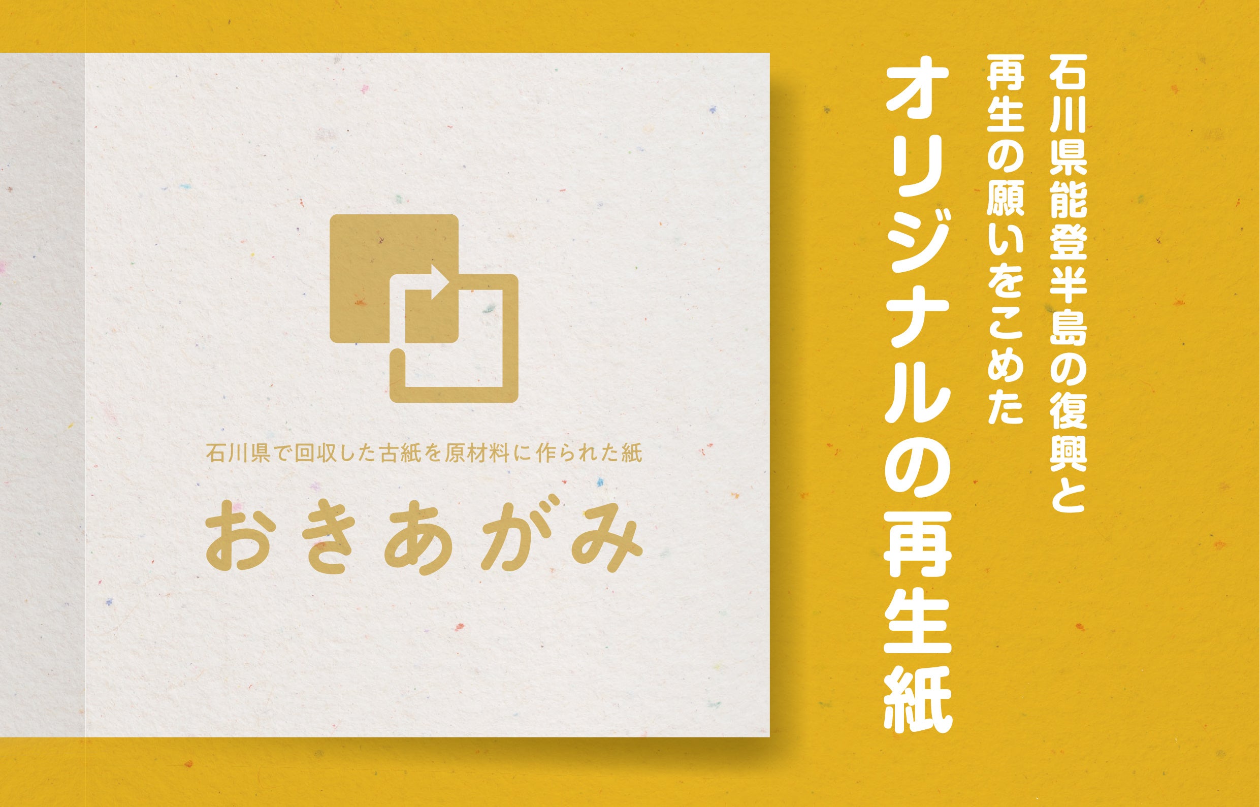 「おきあがみ」は、石川県内で回収された紙資源を再生し、「石川県エコ・リサイクル製品」に認定されている環境配慮型の用紙です。2024年1月に発生した能登半島地震を受け、販売額の一部を義援金として寄付する仕組みを導入し、用紙利用が被災地支援につながる用紙として展開してきました。2025年3月からは全国販売を開始し、「復興と再生」をコンセプトに、多くの顧客にご利用いただいています。