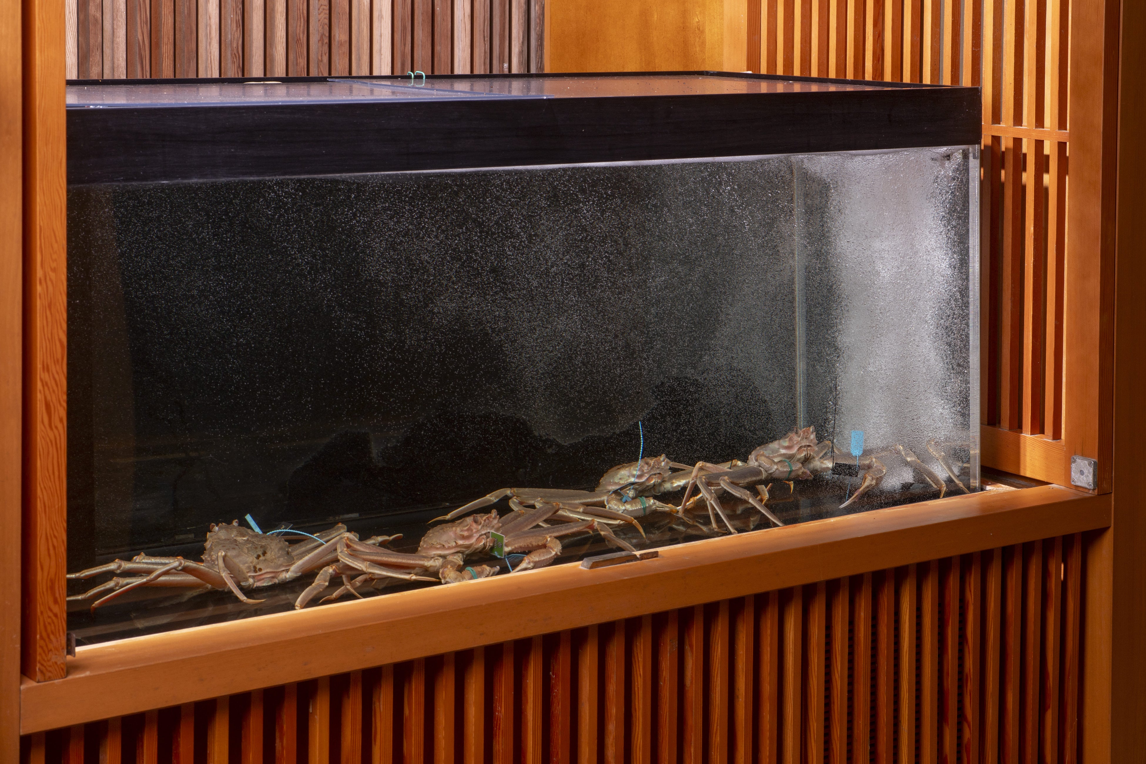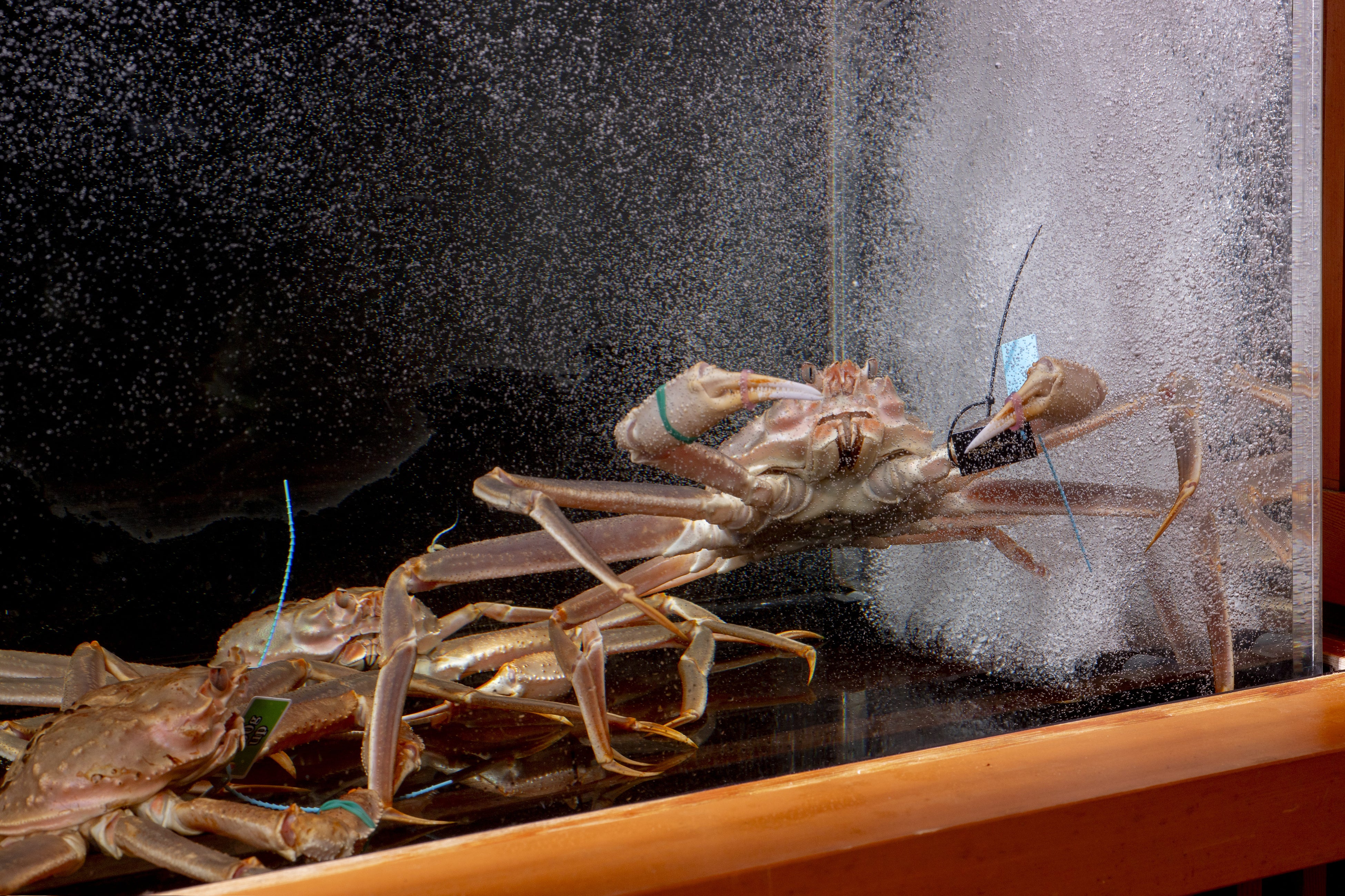 エントランスに設えた活魚水槽で管理する、活ずわいがに
