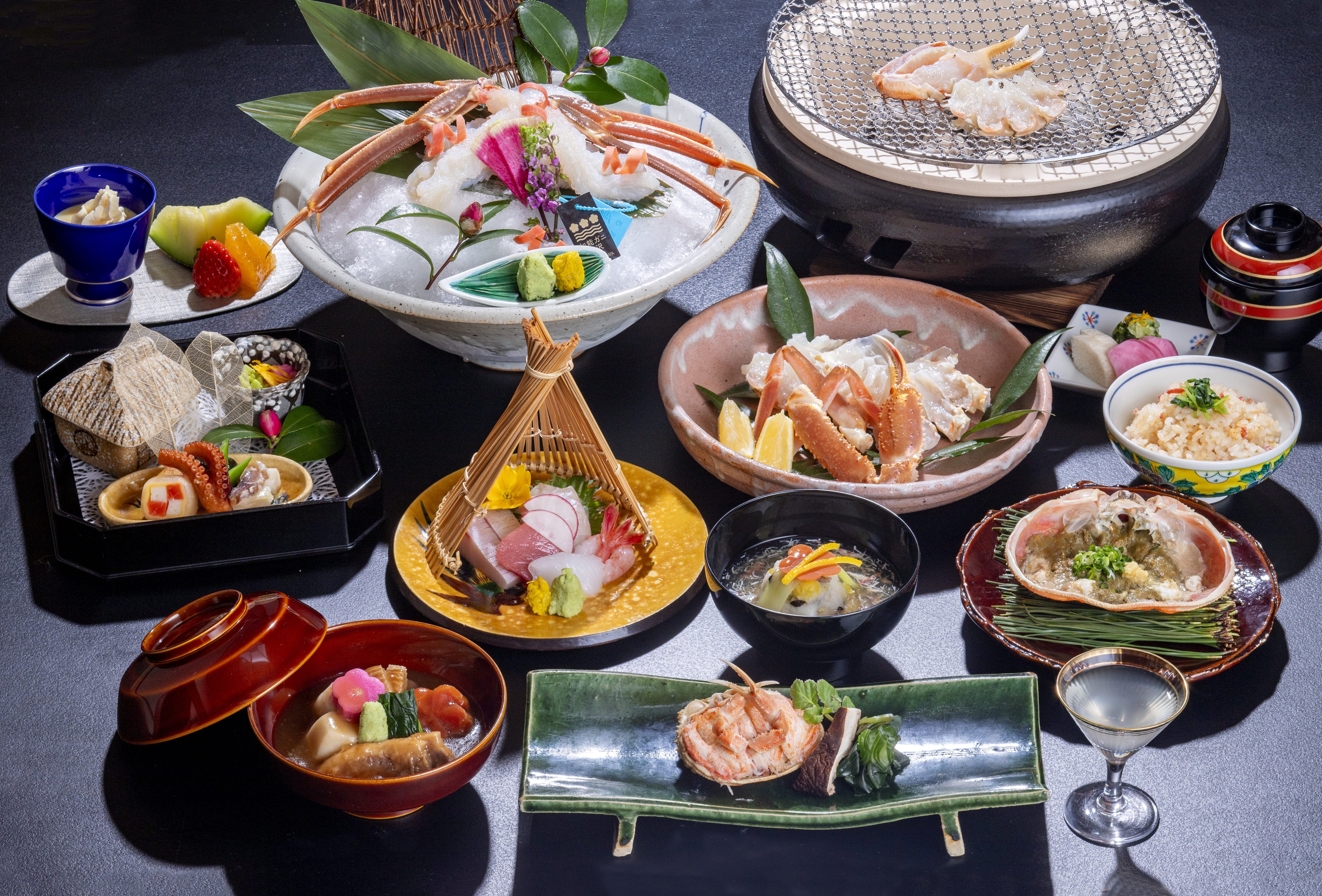 本プランでは、700g以上の「活ずわいがに」を使用し、蟹刺し・焼き蟹を献立に組み込んで提供します。酢の物やご飯ものにも蟹を用い、冬の味覚を会席として楽しめる内容です。