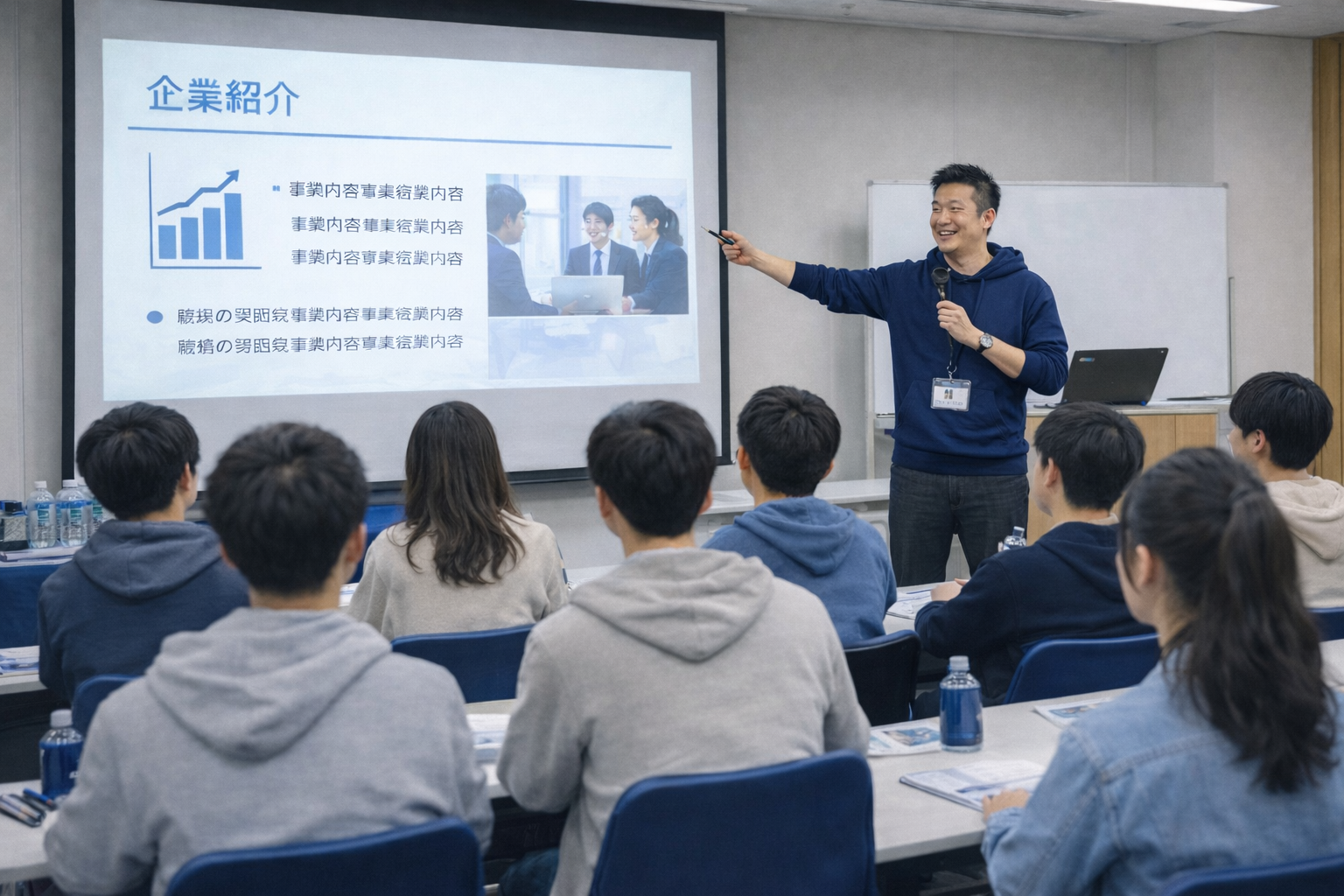 従来の合同企業説明会との違い、 全参加学生が全参加企業と接点を持てるプログラム設計にしています。全企業が全学生に対し、プレゼン方式で順番に会社説明、ローテーション形式の座談会も実施し、全学生に企業ごとの個別アプローチも可能な設計にすることで、近年の売り手市場が進む採用現場の中でも、学生と確実に接点を持てる機会を創出。 また、参加する人事担当は全員ブローウィンズパーカーを着用。会社ごとの雰囲気の差をならすことで、企業名や担当者の印象に左右されず、学生が“企業の本質”をフラットに見てもらえる環境を実現します。