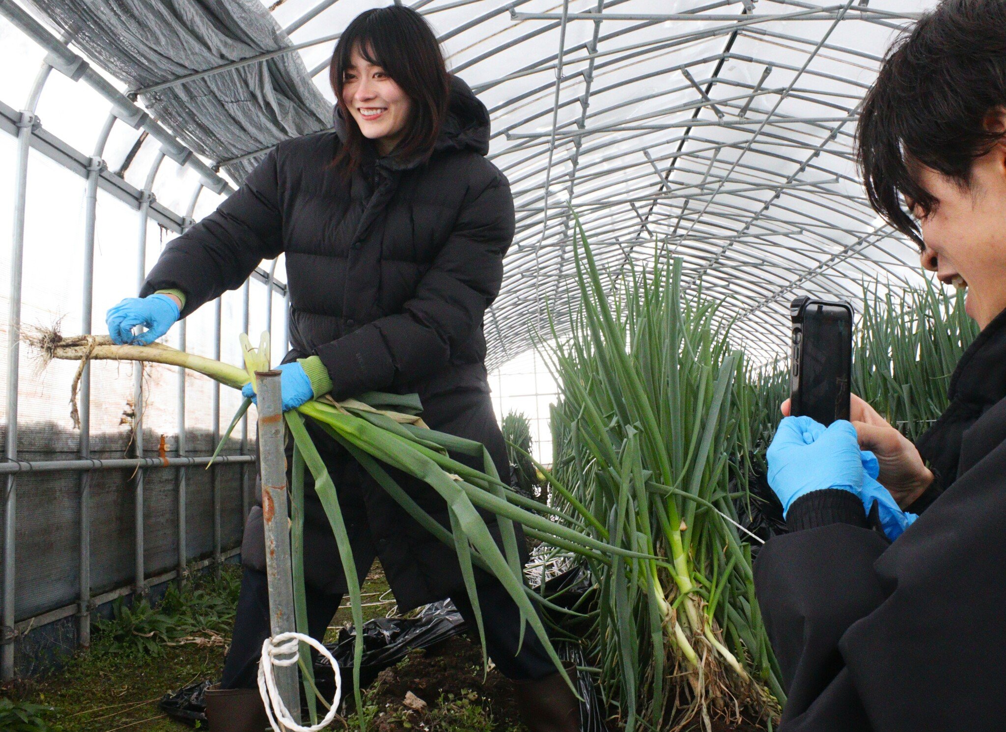 彩雪さんや県内のインフルエンサーら3人が参加した。同町野中の農業法人「アグリおがわ」のビニールハウスでは、芽キャベツとケールを掛け合わせた「プチヴェール」と白ネギの収穫を体験。3人は写真や動画を撮影しながら作業に励んだ。彩雪さんは「食べることを考えたらワクワクした」と笑顔で話した。