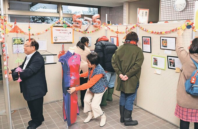 受講生らは24日、会場設営をした。作品のほか、「林」「美」といった線対称の漢字をかたどった折り紙で彩り、2月の中国の春節(旧正月)にちなんで中国結びやチャイナドレスも飾った。同展は北日本新聞社後援。