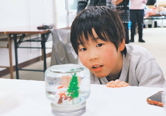 富山県の滑川市児童クラブ連合会の「あそびの達人」が25日、同市の東地区公民館であり、親子15組約40人がスノードーム作りを楽しんだ。