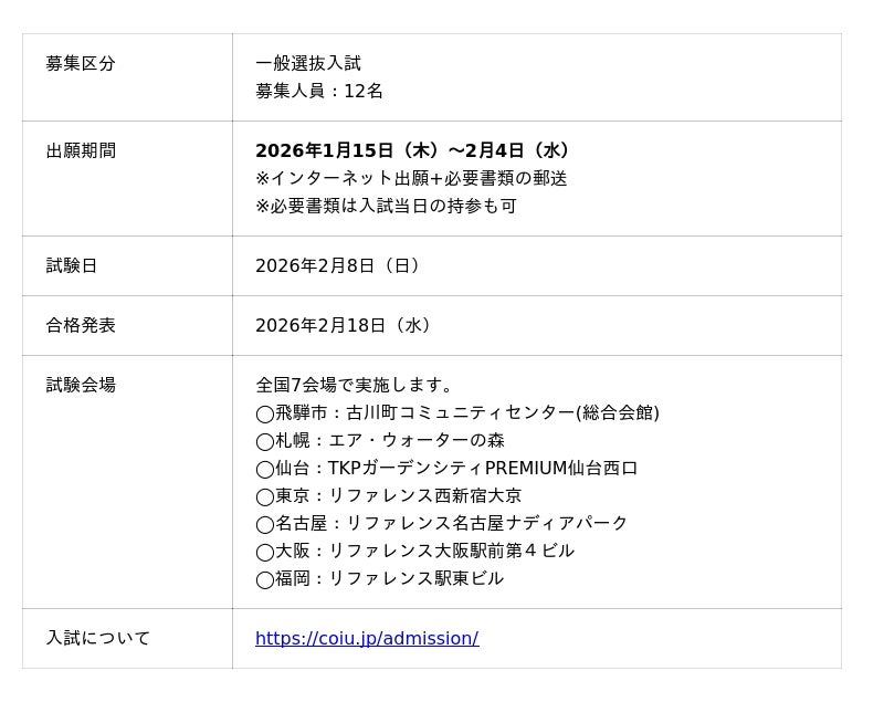 CoIUでは現在、2026年入学者を対象とした一般選抜入試の出願を開始しました。
