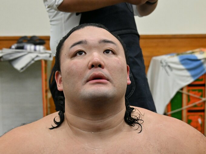 勝ち越しを決め、支度部屋で取材に応じる朝乃山