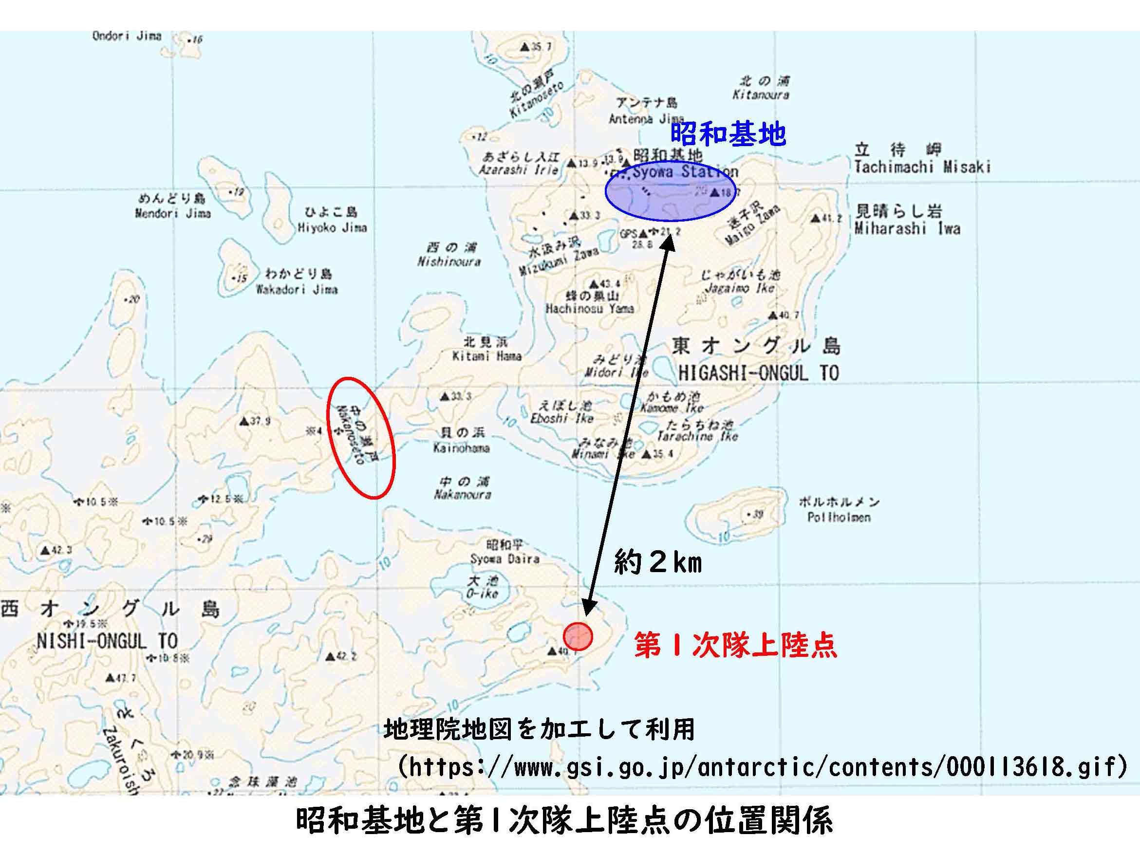 この図を見て、上陸点(西オングル島)で「昭和基地」と命名したにもかかわらず、実際は昭和基地が違う島(東オングル島)に建設されているのに違和感を覚える方がいるかもしれません。実は「昭和基地」命名時にはオングル島は西も東もなく、一つの島と考えられており、オングル島全体を「昭和基地」と命名したそうです。