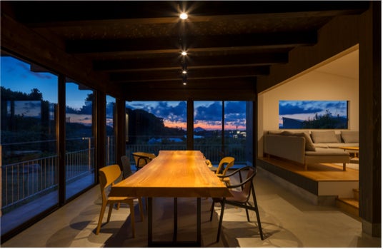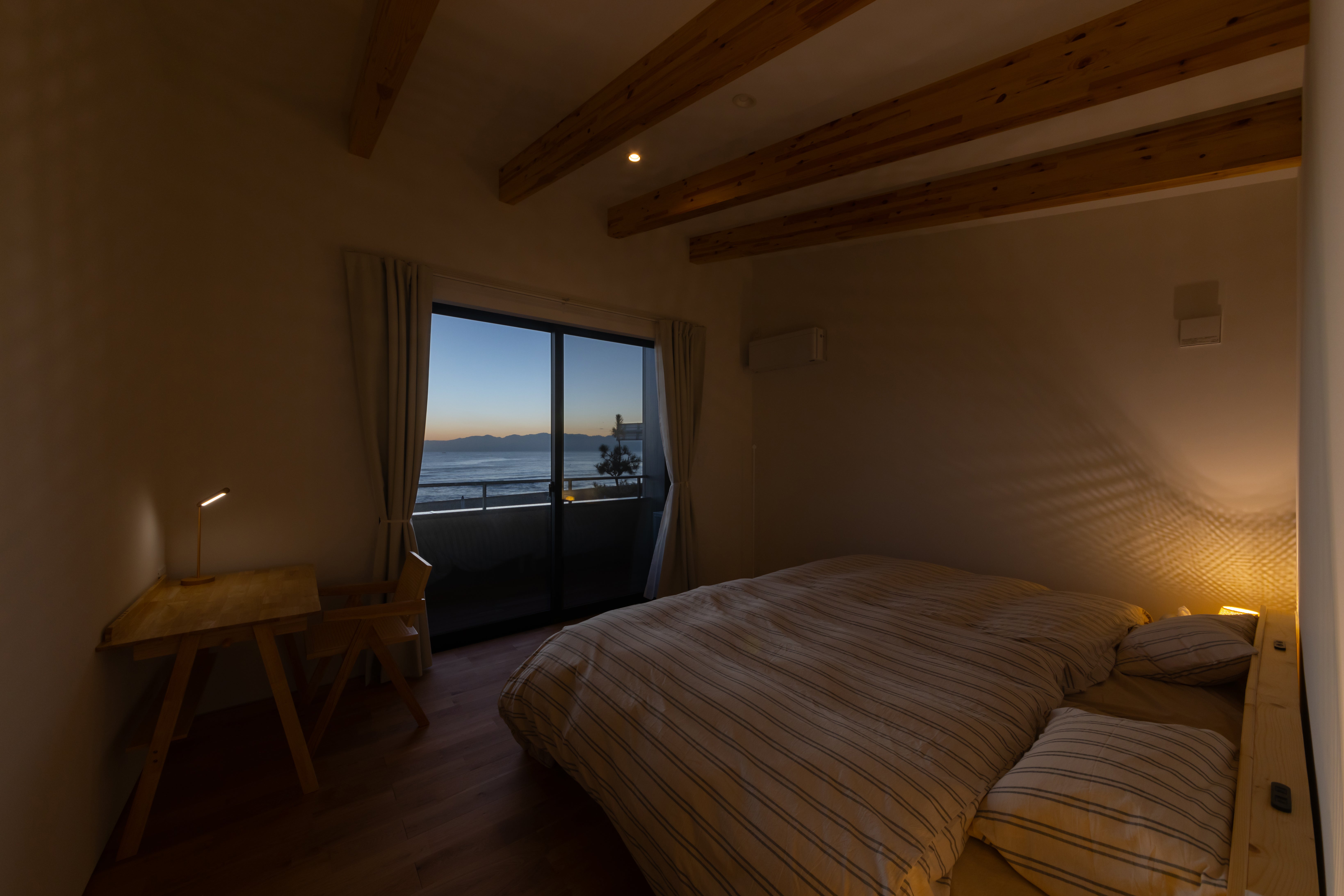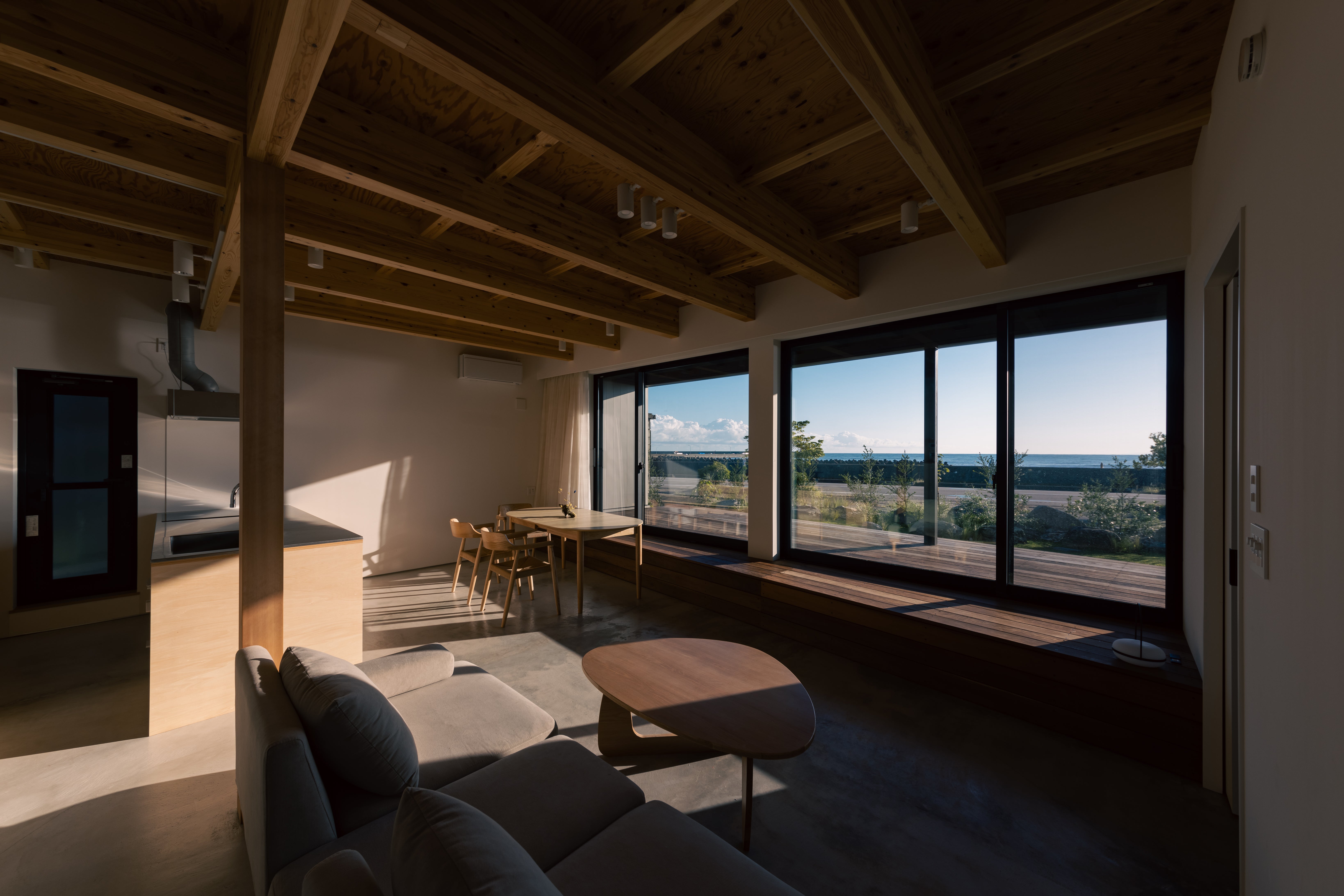 「氷見のうみと」は、氷見駅から徒歩7分の海沿いに位置。目の前に広がる富山湾越しに立山連峰を眺めることができる贅沢な立地です。建物がまちや人に対して“ひらけていること“をコンセプトに、滞在する人が風通しの良さを感じられる空間を目指して設計しました。最大の特徴は、リビング・ダイニングに沿って設けた大きく開放的な窓です。窓を貫くようにリビングから庭へと続くデッキが中と外の境目を曖昧にし、屋内にいながらも外にいるような感覚で、富山湾と立山連峰を望むことができます。外壁には反射によって表情が変わる素材を採用し、早朝の淡いピンク色の空や、雨に濡れた松の木の緑など、氷見のやわらかな光の機微を映し出します。また、城端の松井機業に制作を依頼したしけ絹のカーテンなど、地域の伝統的な素材も空間に取り入れています。