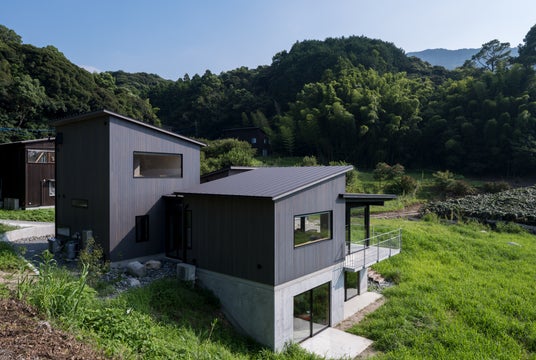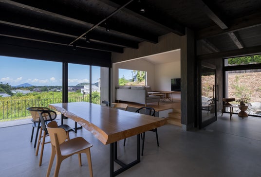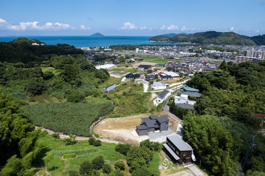 「二丈岳のふもと」は、福岡市街の中心地から車で30分ほどの糸島市二丈に位置。遠目に美しい海と姫島を眺め、敷地内に小川が流れる、450坪の広大な土地です。コンセプトは、”糸島の自然とともに暮らす”こと。眺めるだけでなく暮らしの一部に自然が感じられるよう、建築を一つの箱ではなく、複数の空間が広がった集落のようなイメージで設計しました。