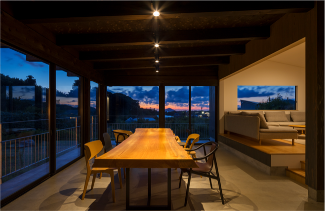 自然素材の室内空間、ガラス張りの開放的なダイニング、一度屋外を通る離れの寝室など、自然と直で触れ合いながら過ごすことができます。一人でいても、家族で過ごしていても、数十人の人々を招いても、人と人、人と自然との心地よい距離感を場面毎に選択出来るような、柔軟さを持った空間をつくることを考えました。