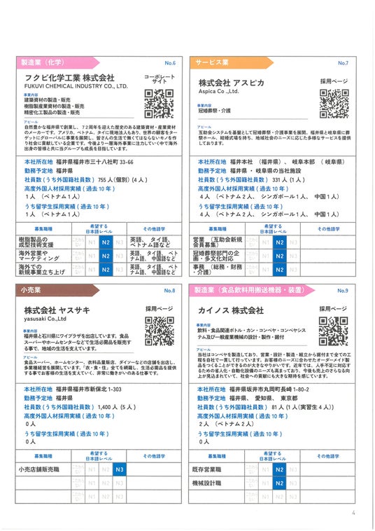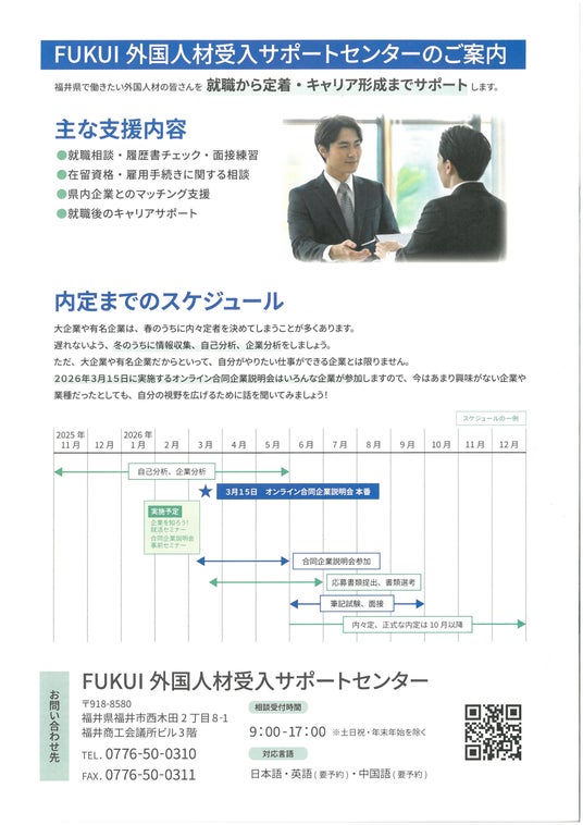 「FUKUI外国人材受入サポートセンター」では、外国人留学生の就職活動を支援するため、在留資格の変更手続き、入社前の事前準備、就職に伴う転居などのサポートを行っております。