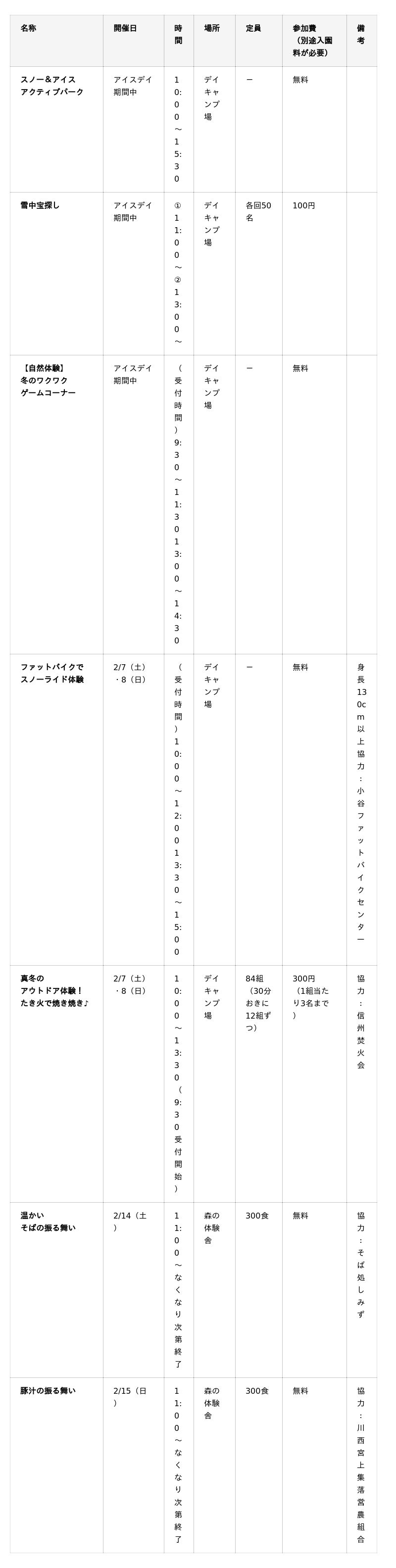 デイキャンプ場をメイン会場に、全長20mのミニ・アイススライダーや氷の一本橋、雪タワーづくりなどを無料で楽しめる「スノー&アイス・アクティブパーク」を実施します。雪の中からカプセルを探す宝探しや、公園サポーターと楽しむミニゲームに加え、焚き火でチーズやウインナーを味わうアウトドア体験、ファットバイク体験、そば・豚汁の無料振る舞いも用意しています。冬のお出かけや思い出づくりに最適です。■期 間/令和8年2月7日(土)・8日(日)・11日(水・祝)・14日(土)・15日(日)