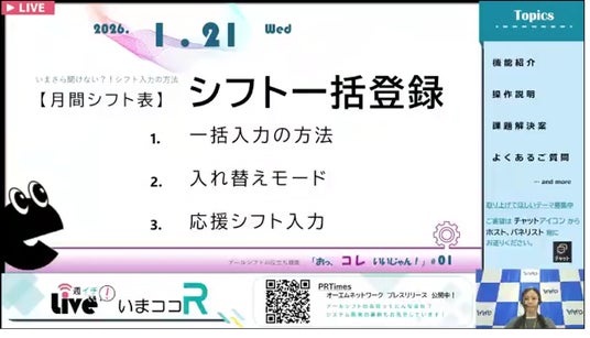 オーエムネットワーク株式会社(本社:新潟県新潟市、代表取締役社長:山岸 真也)は、シフト管理システム「R-Shift(アールシフト)」の既存ユーザーを対象に、週1回・15分の定期ライブ配信「週イチLive!いまココR」を開始しました。