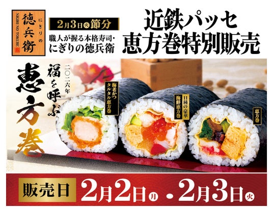 コロワイドグループの株式会社アトム(本社:神奈川県横浜市 代表取締役社長:植田剛史)は、2月3日(火)の節分に向けて、回転寿司業態の「にぎりの徳兵衛」全店舗にて販売中の恵方巻を、期間限定で愛知県名古屋駅前の近鉄パッセで販売いたします。