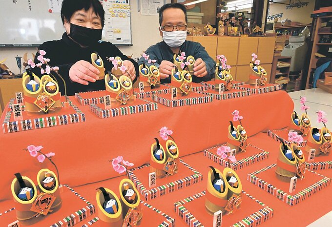 通所者約20人と職員が協力して今月初旬から作業を始めた。顔彩絵の具で描かれた男びなと女びなの顔は一つ一つ特徴があり表情豊か。桃の造花をあしらい、和紙で縁取った華やかな台に飾ってある。高さ約13センチ、幅は約16センチ。