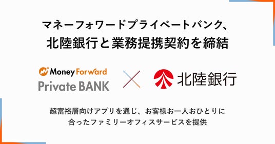 マネーフォワードプライベートバンク株式会社は、株式会社北陸銀行と業務提携契約を締結しました。本契約締結により、これまで北陸銀行単独で提供できるサービスの範囲が限られていた超富裕層のお客さまに対し、両社で金融から非金融まで幅広い領域でパーソナライズされたサポートを提供できるようになります。