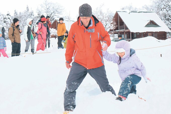 かんじきレースには、大人と子どものペア12組が参加。赤座千花子さん(富山市神通碧小2年)、由実子さん(同1年)姉妹はそろって出場し、父親と一緒にレースを走りきった。由実子さんは「歩きにくかったけれど、ふわふわの雪の上を走れて楽しかった」と笑顔を見せた。