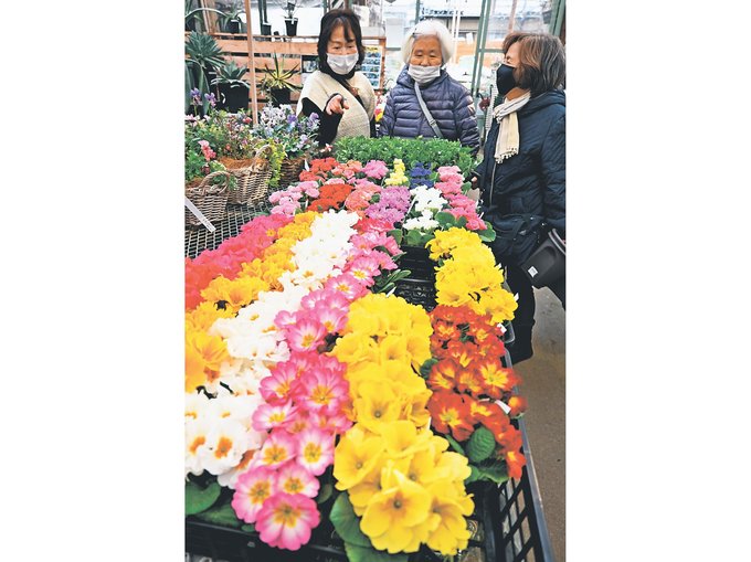 同店には、愛らしい花を咲かせた400円台の苗が多く入荷している。寄せ植えにも向いており、上手に育てれば3月末ごろまで楽しめるという。富山市から訪れた女性客は「プリムラの『ジュリアン』という品種の苗が入ったと聞いて来店した。きれいな花」と早速買い求めていた。