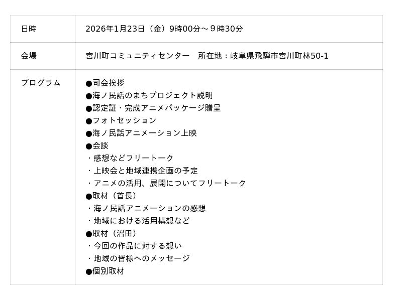 一般社団法人日本昔ばなし協会と日本財団が取り組む「海ノ民話のまちプロジェクト」は、2026年1月23日(金)に岐阜県飛騨市を舞台にした海ノ民話アニメーション「嫁が淵」が完成したため、アニメ監督が飛騨市を訪問しアニメのお披露目と「海ノ民話のまち」認定式を実施しました。