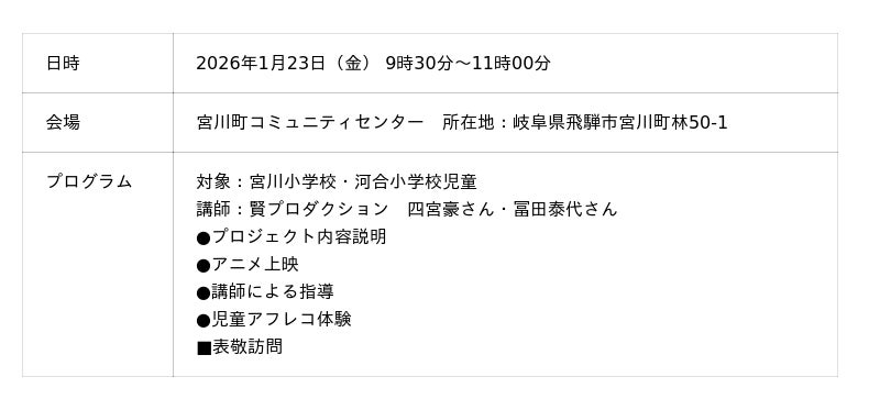 予定通り宮川町コミュニティセンターにて実施。冒頭にアニメーションの上映を行い、その後は実際に声優を務めた四宮豪さんと冨田泰代さん(賢プロダクション)による朗読授業とアフレコ体験が行われた。最初は低学年と高学年の2グループに分かれ、セリフを言う際に気を付ける点や表現の仕方の説明を聞き、やってみたい役ごとに練習に励んでいた。アフレコ体験は低学年グループから実施。はじめは実際のアニメーションの速さについていけず苦戦していたが、繰り返すうちに声の抑揚や表現方法を工夫する姿がみられた。体験した児童からは『楽しかった』『声優のすごさを体験できてよかった』『またやってみたい』といった声が聞かれた。