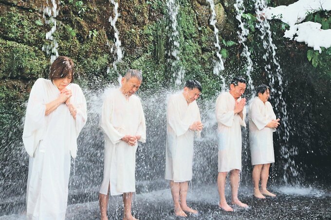この日は10人が2グループに分かれて滝行。寒空の下、白装束に身を包んだメンバーが手を合わせて六本滝に1分間ずつ打たれ、世界平和や家族の健康など思い思いに祈願した。