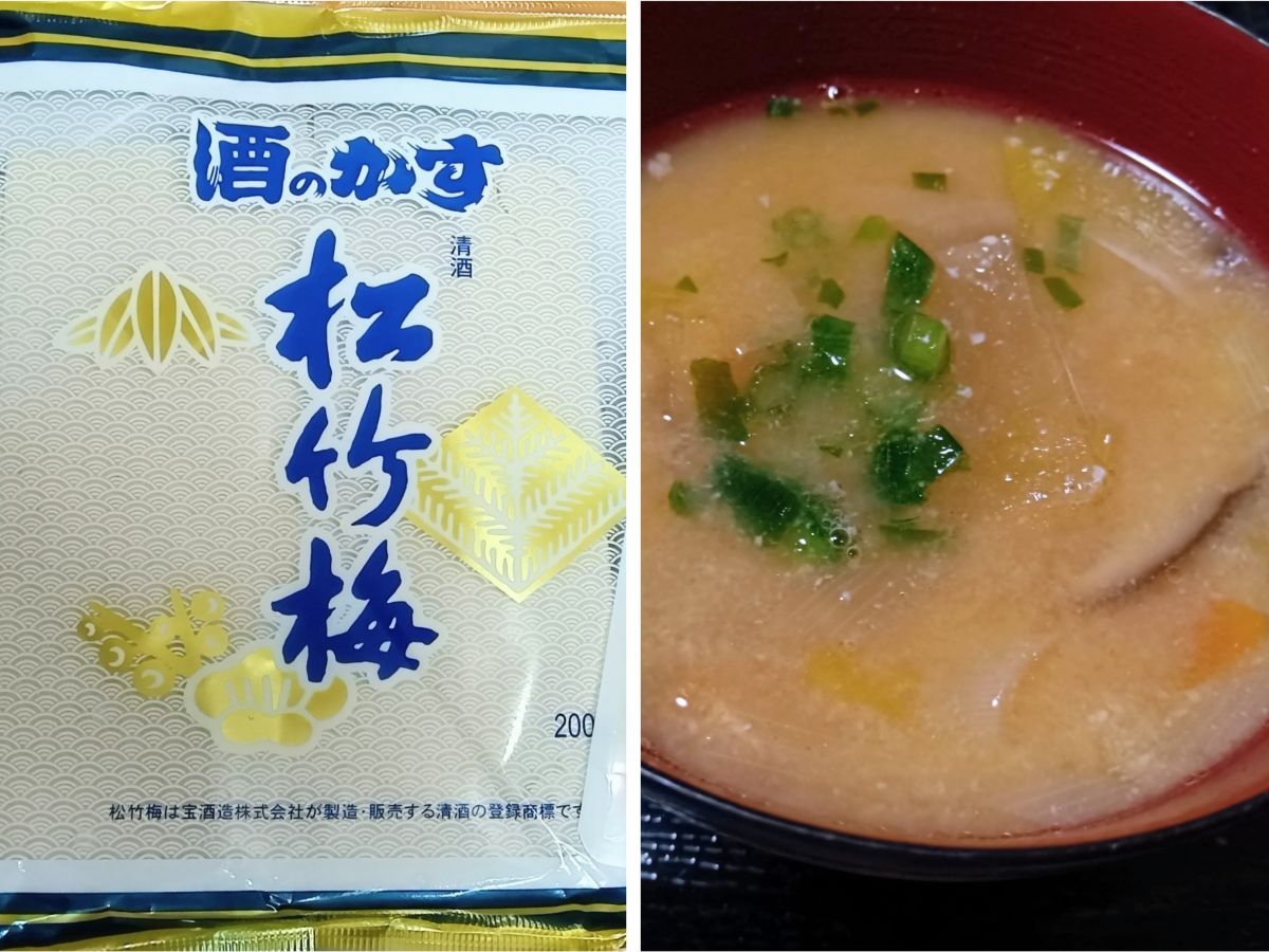 そして冬場に活躍するのが『酒粕』。普段通りに作った味噌汁に、酒粕を加えるだけです🍲(味噌は少し減らします。別容器にちぎった酒粕を入れ、調理中の味噌汁で溶かします)