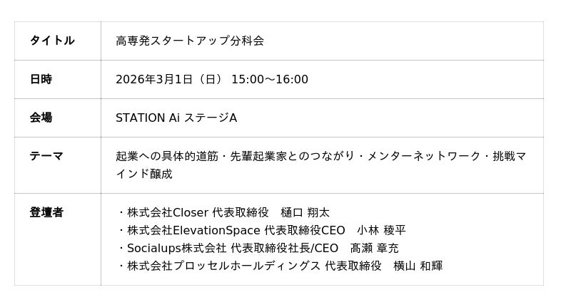 高専人が持つ技術力と実践力を結集し、人材・テクノロジー・ものづくりの領域で事業を展開する株式会社プロッセルホールディングス(本社:新潟県新潟市、代表取締役CEO:横山和輝)は、2026年3月1日(日)に開催される高専人会総会「KOSENJIN SUMMIT 2026」の分科会において、代表の横山が登壇することをお知らせいたします。登壇する分科会は「高専発スタートアップ分科会」です。