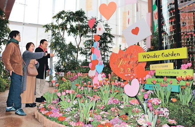 ピンクや紫色のプリムラ類470鉢や、色鮮やかなラナンキュラス、スイセンなどを展示。チューリップは赤と白色の「タイムレス」や濃いピンク色の「ジャンボピンク」といった約5千本を並べた。バレンタインデーやホワイトデーに合わせ、ハートの装飾でも愛らしさを演出している。