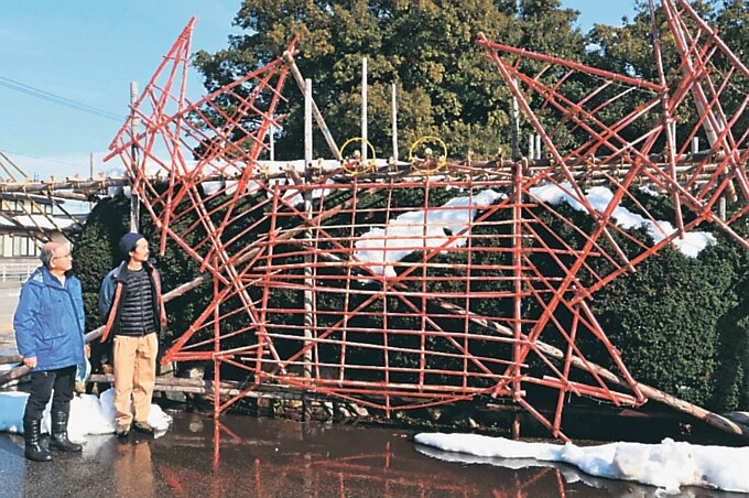 富山市森の岩瀬スポーツ公園に、地元の名物をモチーフにした創作雪つりが飾られ、訪れた人の目を引いている。展示は3月上旬まで。