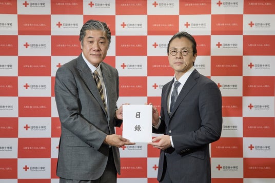 目録贈呈の様子 (左: 日本赤十字社 パートナーシップ推進部次長 高部雄一様 / 右: 株式会社ポーラ・オルビスホールディングス コーポレート室長 阿部祐大)