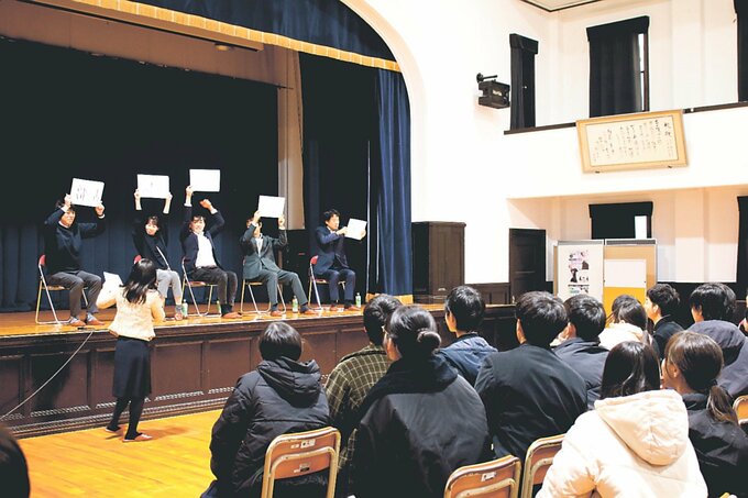 5人の職員が進行役の職員との掛け合いで、学生時代を振り返りながら打ち込んだことや進路を決めた理由、仕事のやりがいなどを紹介した。受験の失敗や失恋話も本音で語り、生徒たちは興味深く聞き入っていた。